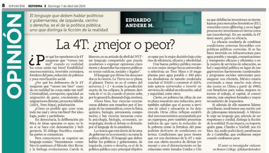 Eduardo te saludo y te felicito por tu columna del Reforma. Me encantó la manera en que planteas la ambigüedad de lo que actualmente sucede. Recibe un fuerte abrazo mío y familiar.