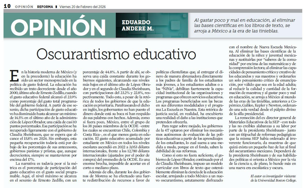 Hoy publico en Reforma mi columna titulada “Oscurantismo educativo”, en ella reflexiono sobre el rumbo de la educación en México y el desastre que e avecina si no se corrigen las decisiones de política educativa.