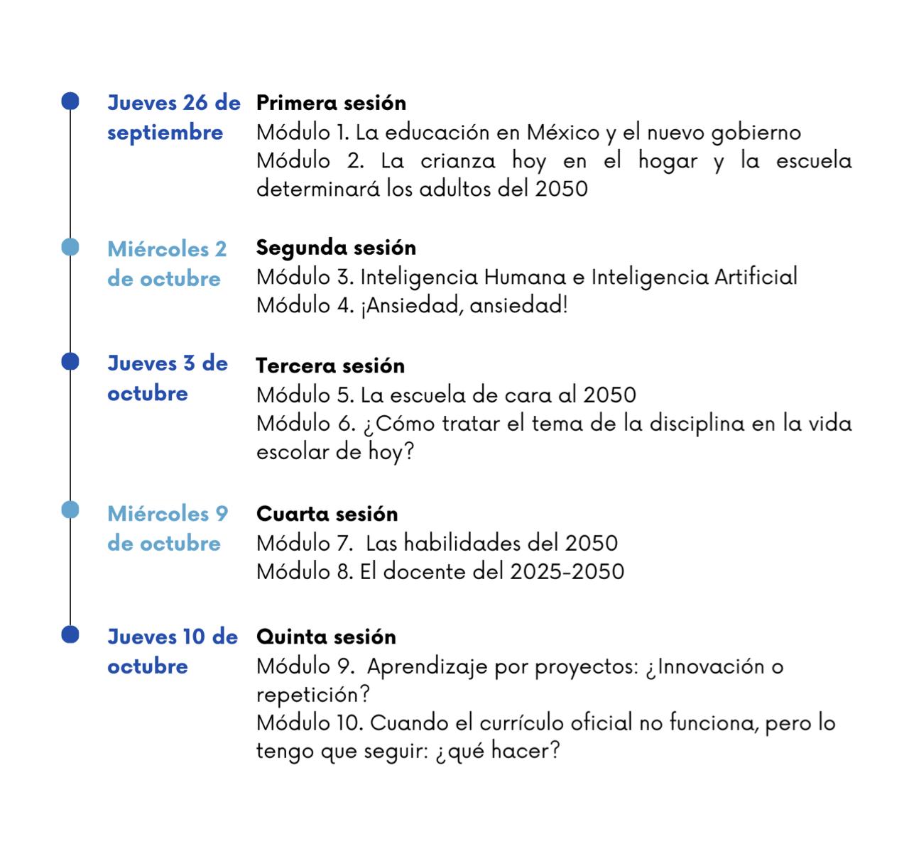 Horario para las cinco sesiones: 6 pm a 8 pm (Hora de la Ciudad de México)